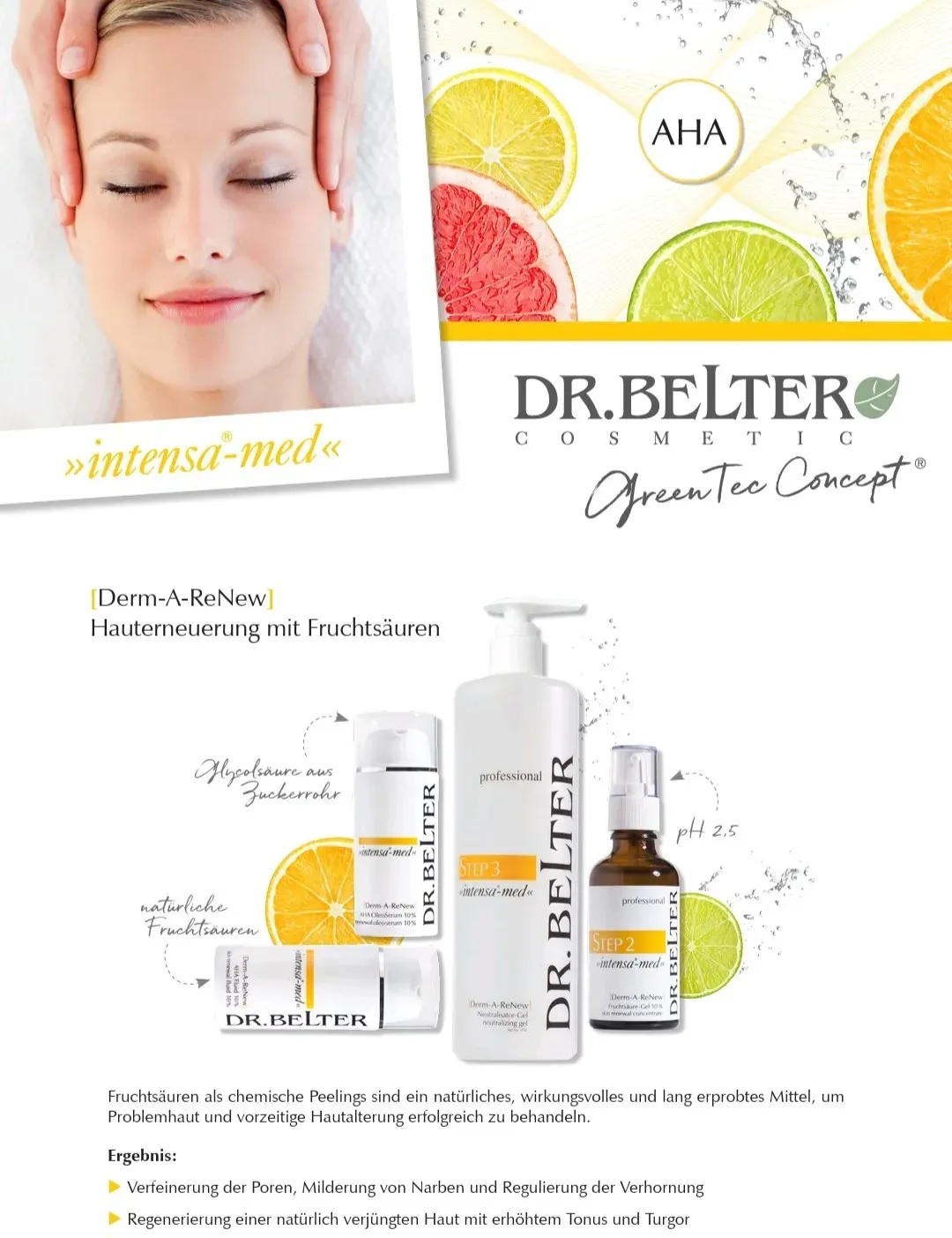 Das Dr. Belter® Derm-A-ReNew System ist ein speziell entwickeltes Fruchtsäurekonzept für Kosmetikinstitute. Es verbindet fundierte dermatologische Erkenntnisse mit hochwirksamen Pflegeformulierungen – abgestimmt auf unterschiedliche Hautbedürfnisse.